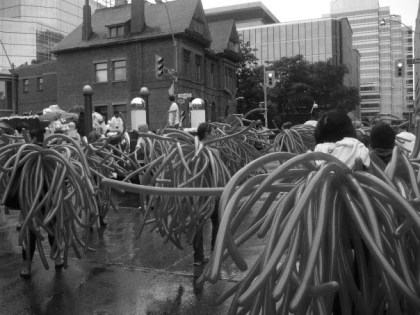 Last year my friend Mikey Sin (Fabulous Photographer and Fashion Designer who I’ve known since I was Sixteen!) and I were in the Parade as Aids Ribbons a Part of the ACT (Aids Committee Of Toronto) float. The ribbons were red balloon wings and looked so awesome, just before it was our turn to march it started to pour down some serious rain, midway through the Parade my flip-flop broke! The water made the glue unstick with the constant friction, I needed to buy a new pair fast, nope that did not happen! It took us three hours to find a store because everyone wanted a picture with us, we found a store finally! A couple of people followed us into the store just to take a picture. I’ve seen it happen to so many people so many times but I’ve never been the target of such hardcore stalking! Exes and weirdoes don’t count! (Laughs) Feeling a little dizzy no food all day I needed to eat something, it took us half an hour to get street meat and even longer to eat it! Mikey eventually told people no more photos because honestly I was tripping out, the crowd was growing by the minute it was really scary! People were throwing their kids, grandbabies, dogs, cats whatever and who they had with them into the last set of pictures. I totally understand and feel for people who have to deal with the craziness on a daily basis. Funny thing is, about five hundred or so people have a picture with us holding a hotdog!! When we finally escaped and found a place to hide from the people (Good thing I know Downtown Toronto like the back of my hand!) the hotdogs were so cold! That was too crazy of an experience! This year we opted for more coverage rather than marching in.