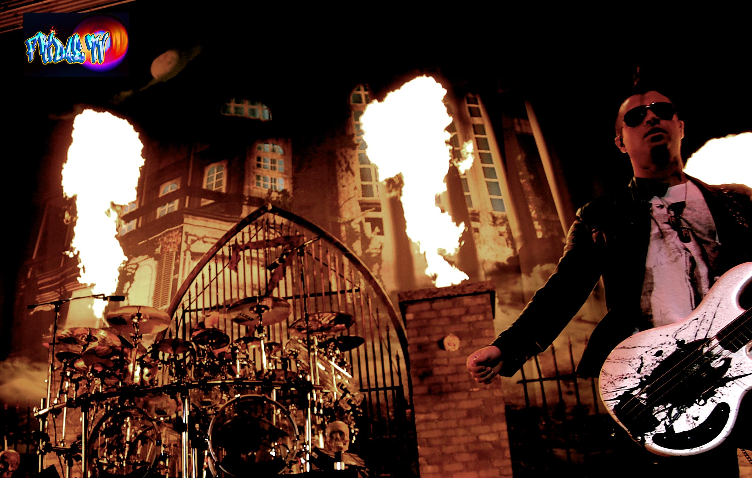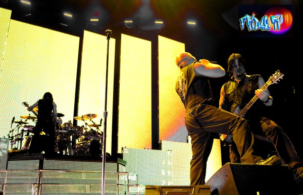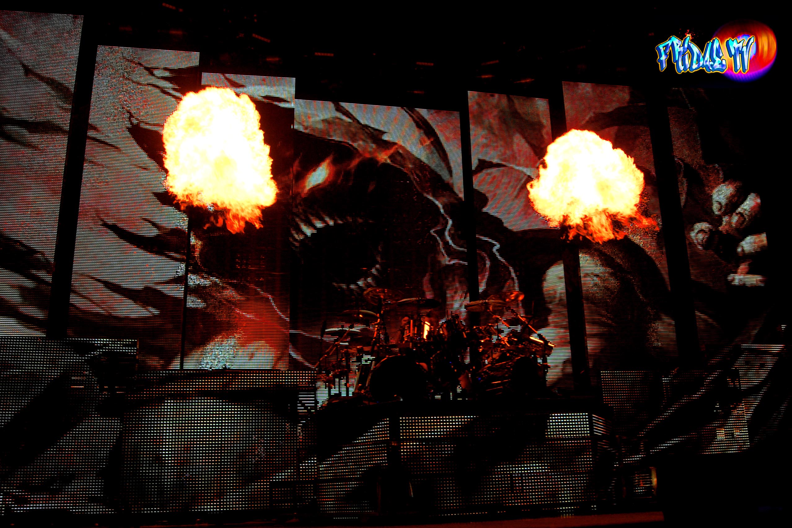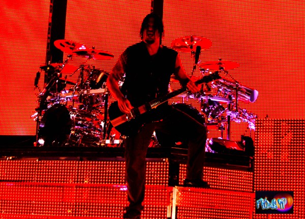 As he dangled the creepy intro set in, I loved it. I’ve always been a huge fan of horror films this track felt like it was pulled right out of ‘Nightmare on Elm Street’. The crowd exploded once the guitars came in with some crazy pyro to the beat of the drum causing the illusion of setting the hauntedish house of Nightmares in the backdrop a blaze (I love fire). The band is: Singer M. Shadows (Matthew Sanders), Zacky Vengeance (Zachary Baker) on Rhythm Guitar, Johnny Christ (Jonathan Seward) on Bass, Synyster Gates (Brian Elwin Haner, Jr. ) as Lead Axemaster and Mike Portnoy of ‘Dream Theater’ as the current Drummer. I was seriously impressed with this band; they had solid harmonies the whole set, backing up lead Vox on cue when he was out of breath. The skills on these larries were obvious you could hear and see the legends in the making. It didn’t matter whether I was up close or kicking it on the lawns, the sound was impeccable, lead vocals were the closest to flawless I’ve heard in years from a major rock band. Sanders can sing; he has a nice full tone, grit and a blend of screamage with melodic singing. On record it sounds as if he’s congested and forcing it, I guess the vocal sessions are paying off, you would never know he had surgery on his chords recently.