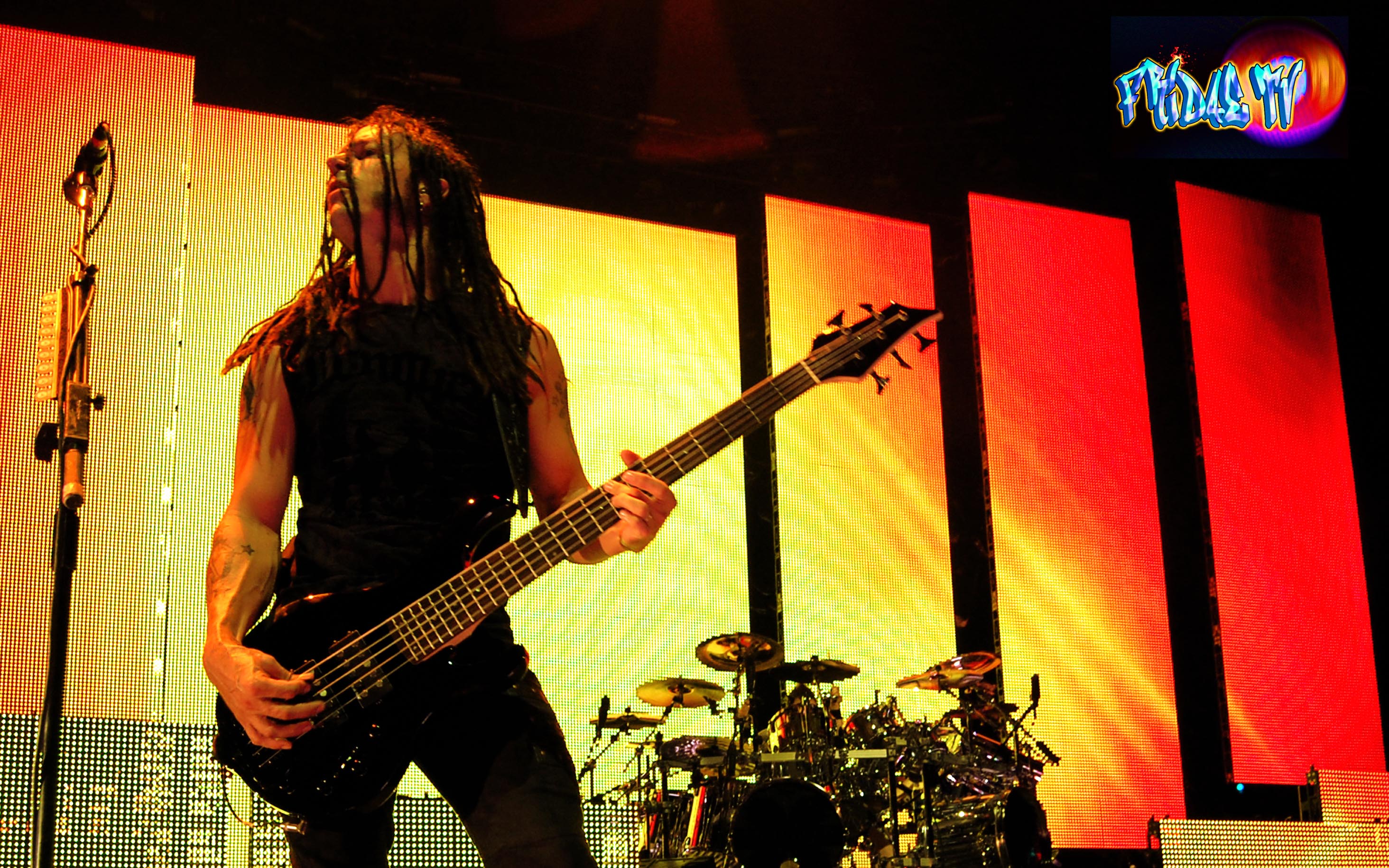 Phenomenal musicians, Moyer on Bass rocked out he was as entertaining to watch as Donegan playing that axe with ease and precision. By the third tune I noticed my ears were not feeling Draiman’s vocals sounding dry and nasally, this was my first time seeing Disturbed live, I recognized tunes like the hit ‘Inside The Fire’ where they had the sickest pyro of the set, the backdrop had flames on the screen as well. I laughed when I saw a chick’s tank top fly just past my head almost landing on the stage. It reminded me of when I was doing research for one of my films a few years back. I was sitting there in the lobby of a hotel in Toronto writing in my notebook and I noticed these two women in the lobby wandering around, one looked so cracked out, her outfit mismatched looking like a ‘clash clown’. Anyways they disappeared again and these larries came into the lobby standing close to where I was sitting, they looked so familiar to me but I couldn’t remember where I’ve seen them. I continued writing as they lingered, all of a sudden I hear a bunch of screams as I look up I saw flashes coming from those two ‘Clash Clowns’ taking pictures with these larries. At this point I’m confused still trying to place the dudes as these girls were doing a photo shoot and asking for what seemed like fifty autographs. Not long after the commotion, hotel security wandered over to the girls and told them they had to leave if they weren’t guests of the hotel. The females migrated once they obtained what they wanted, squealing like a couple of Teenies (Teenies = Younger Diehard fans) as they left. Both of the women were probably about forty five or so, they were pretty old. I floated outside soon after to find those chicks and figure out who those larries were, I honestly could not remember and they kept staring at me. I asked one of the clowns when I went outside and she rudley replied with “Disturbed” her face had the dirtiest look like I was completely retarded meanwhile she looked like Mimi from the Drew Carey show.