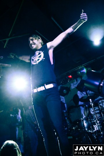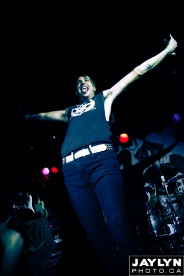 They started the set with ‘Try Hating The World’, a punch in the face angst ridden tune that has a fast paced high energy feel, perfect track to kick off the set. Crouch has been known by others to over perform and yell rather than sing, what I was getting is a true performer who knows how to entertain his audience. Obviously he stands out from many leads when it comes to being comfortable with the stage and captivating a crowd. His vocals are interesting very rare for this style, I actually fully understood what he sang because he enunciated his words properly. Super daps for being able to pull off screams, sing melodically and keep the fans on their toes. Crouch owned the audience before Cirillo’s sticks hit those skins; all boring bands need to watch and learn how a real Front Larry breaks it down. For those that think he over performs, go listen to your Josh Grobin and take a nap because that is boring. My official opinion is that Crouch does not need to calm the fuck down! He needs to keep doing what he does, it is most definitely working to their advantage, the best way to get noticed is to give the people a show to remember!