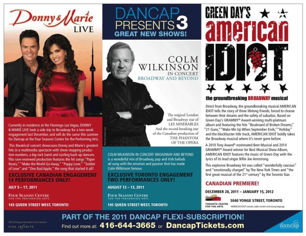 Dancap Productions added two new shows to their 2011 line-up at the Four Seasons Centre for the Performing Arts: DONNY & MARIE and COLM WILKINSON IN CONCERT: BROADWAY AND BEYOND; and one new show at the Toronto Centre for the Arts, the explosive Broadway musical GREEN DAY’S AMERICAN IDIOT.