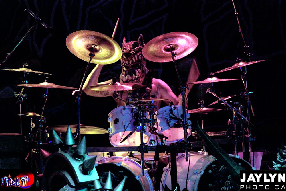 Gwar left the stage, to the chant of their name only to come back a few minutes later for an encore. Upon their return they brought back three female treats for the castle monster that was chained up under the drum raiser. Oderus cut the chain freeing the beast as it emerged, growing in size; they fed the monster blood covered girls. One by one the beast devoured the tasty treats, only to meet its own demise when Oderus turned on it and chopped its head off all while playing “Maggots Are Falling Rain”. Ending the night off with a bang they finished their set with “Sick of you” while Oderus’s big shlong spewed blood all over the fans like nasty money shots.