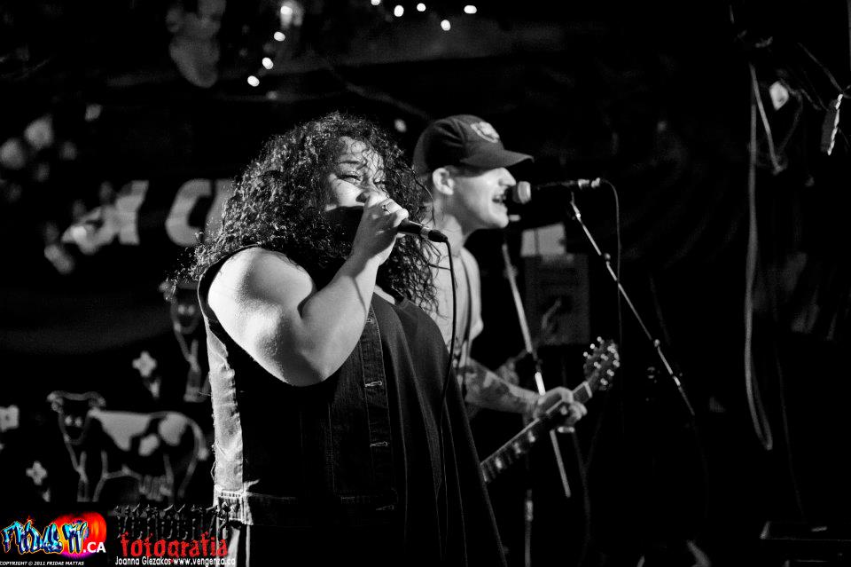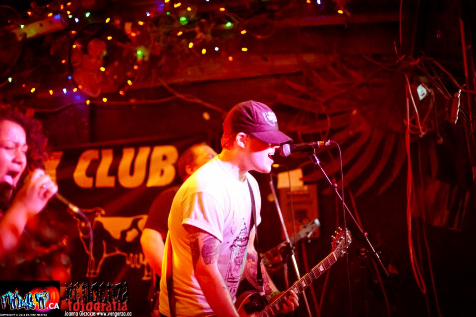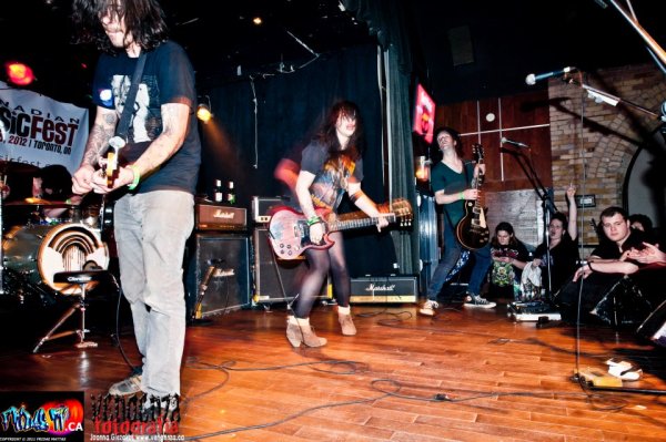 Soon after Janet Panic’s set was a wrap the venue filled up and Die Mannequin was about to hit the stage. Current line up includes Care F (Vox & Guitar), Anthony “Useless” Bleed (Bass) Dazzer Scott (Drums) and Stacy Stray (Guitar). I must admit the first time that I saw Die Mannequin I was a bit put off by the fact that Care F performed after chugging a 26 oz bottle of Jack Daniels. I was glad this time around she drank a bit less and functioned a bit more, she only drank a bottle of beer or two, I would have had a few of them too! She was very energetic which was great and a lot more fun to watch this time. The performance was strong start to finish and the crowd cheered more and more with each song. They performed a few new songs from their upcoming album tentatively scheduled to be released mid-April. During the set they also plugged the film they’re featured in Bruce MacDonald’s “Hard Core Logo 2”, expect to see more from Die Mannequin with a new single on the way and music video they are not going anywhere but up. It was great to see two very strong female musicians kick off my Canadian Music Week!