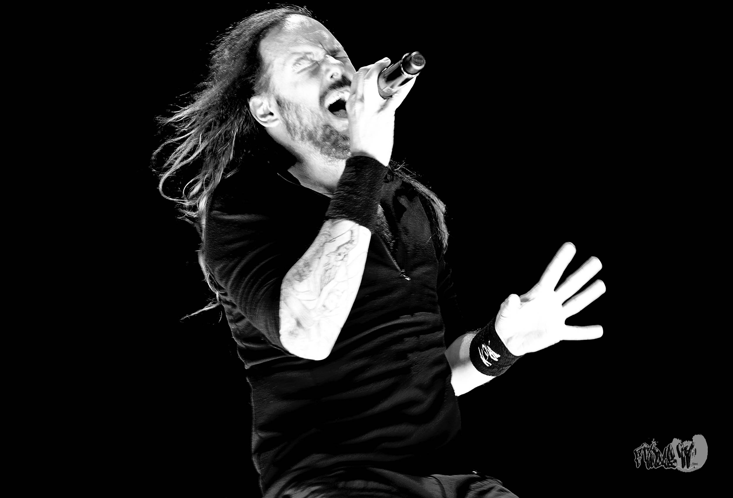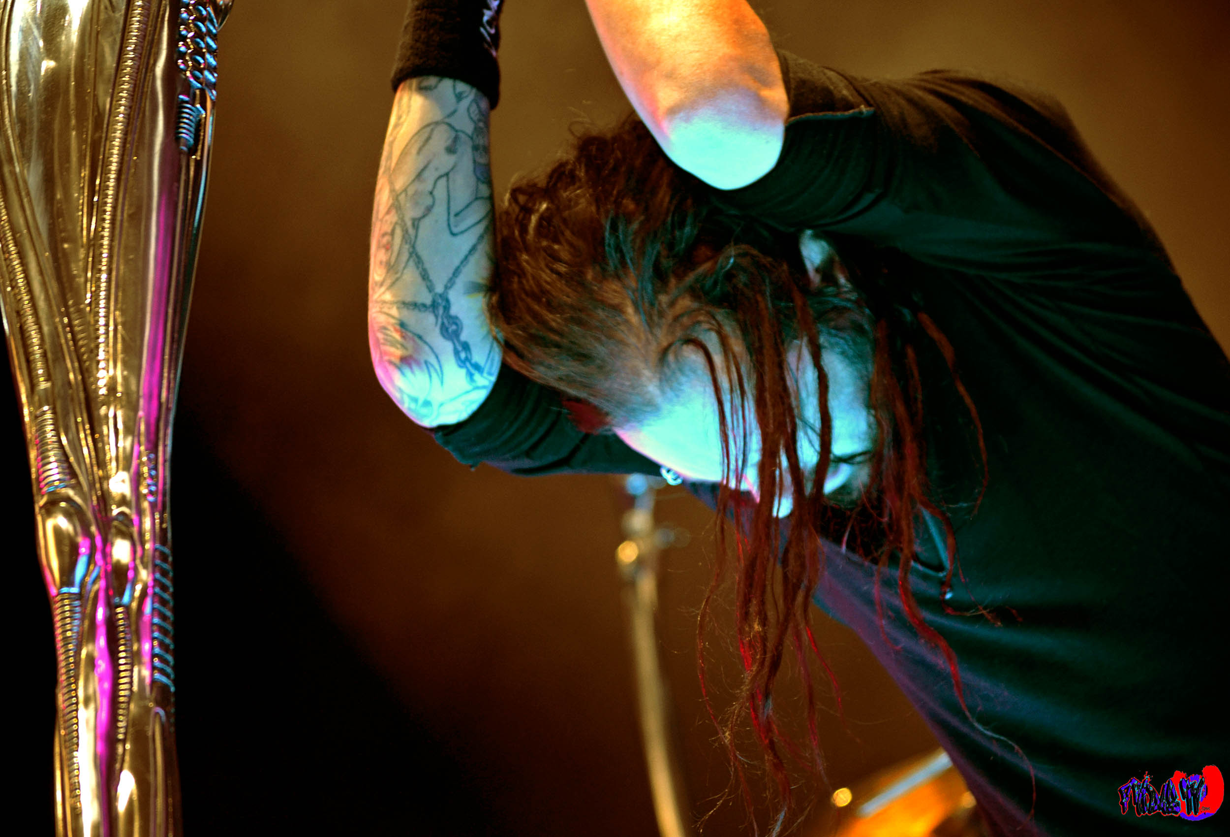 The moment of truth was upon us, would they blow my mind or totally blow and turn me off the band completely? The answer is…They were mindblasting! I loved every minute of Korn’s set and they truly showed their veteran skills off! The first to hit the stage was drummer Ray Luzier, he sat down and counted the rest of the band straight into the “Molested” intro, before they rocked the first track of the set “Falling Away From Me”. That tune was followed by “Twist” one of my favorites from the record “Life Is Peachy”. I was trying my best to get the cleanest shots possible in this media pit frenzie. Some faces I recognized others I didn’t and definitely can’t keep up with all of these new media outlets. I don’t pay attention to the competitors but I know most of them have grabbed a few ideas and words from me. Frontman Jonathan Davis is in surprisingly decent shape for a man of his age, and sang well enough to retain me as a fan. There were times in the set I thought his mic stand was going to go flying when he really got into a song but I think it was shellacked on the stage or something because it stayed. From a critics perspective, a frontman with Davis’s experience should know how to build more of a connection with the audience, engage with the people a little more, they are there to see you, talk to them. At least Davis was visibly enjoying himself, throwing smiles at the fans here and there between songs. I remember seeing another favorite band and the singer was in a corner by himself the whole set, that was a huge disappointment.