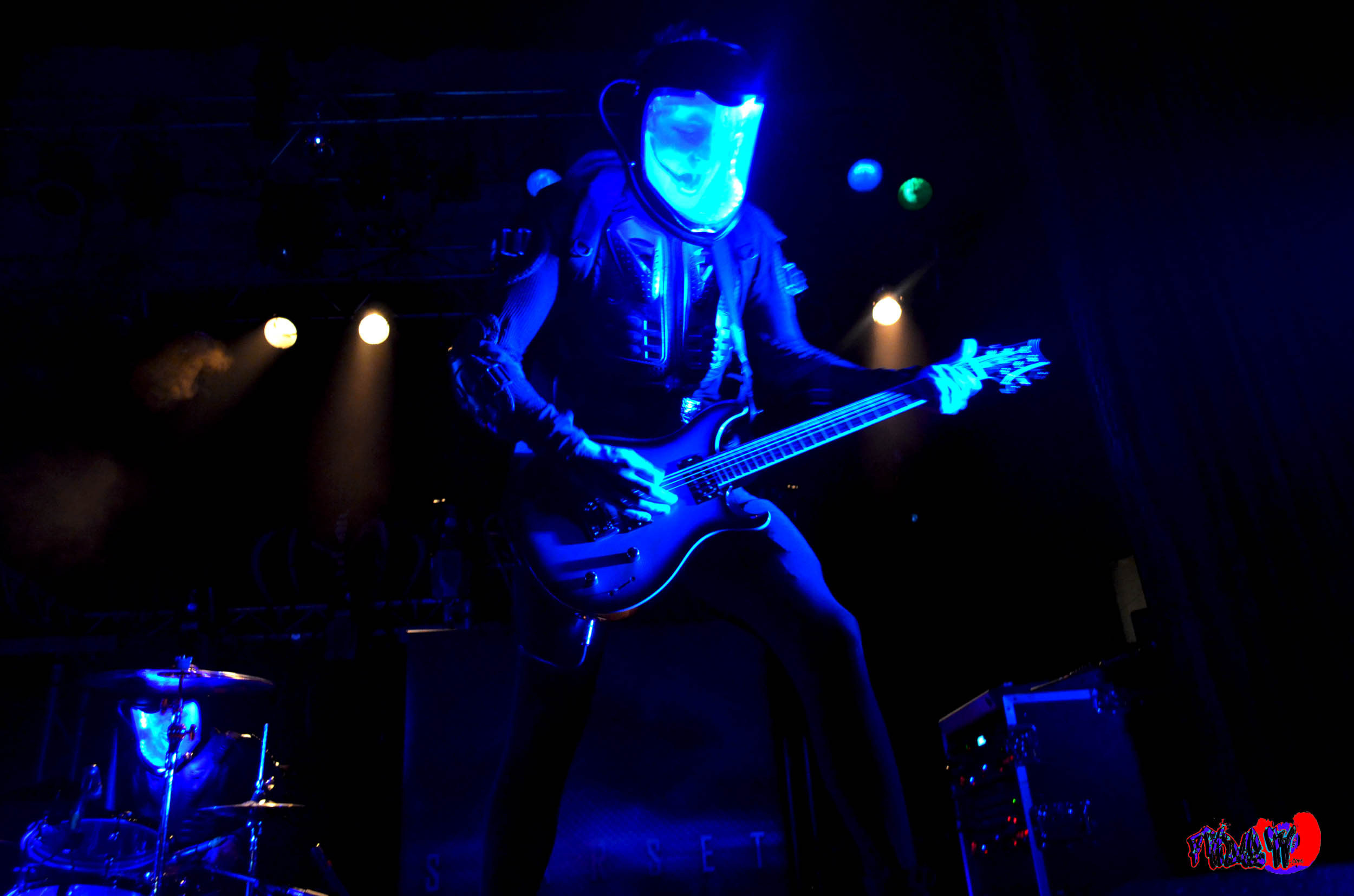 Up next was a fresh band for me, Starset from Columbus, Ohio. I was the only one shooting the first two bands and didn’t know what to think when the band emerged on stage with lit space helmets on their head and rocking in black tights. The only one not in costume was lead vox Dustin Bates, the rest of the band Ron DeChant, Adam Gilbert and Brock Richards were glowing.